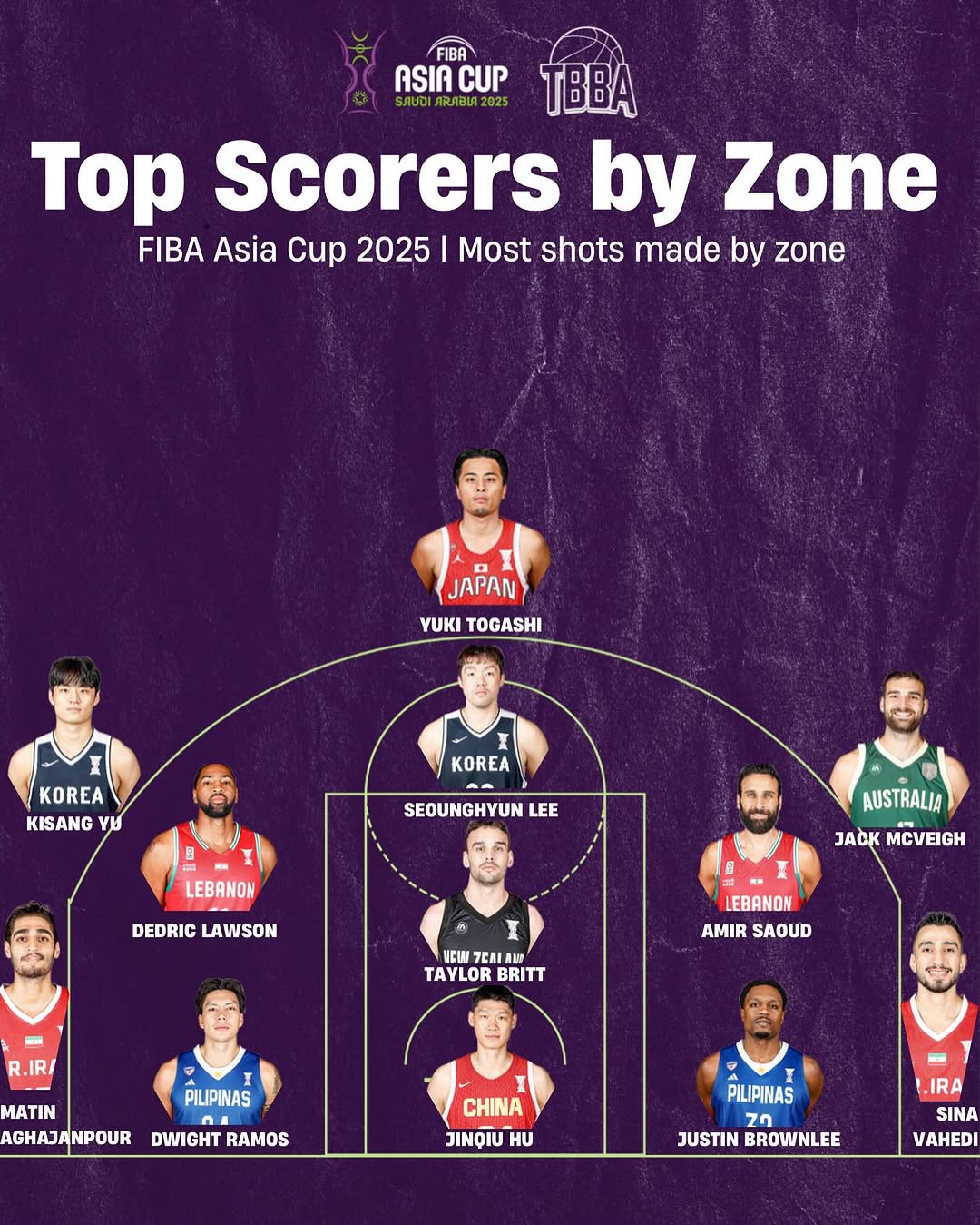 虎扑08月25日讯 外网博主tbba_mena 统计了2025年男篮亚洲杯赛事中,不同投篮点位命中率最高的球员:
